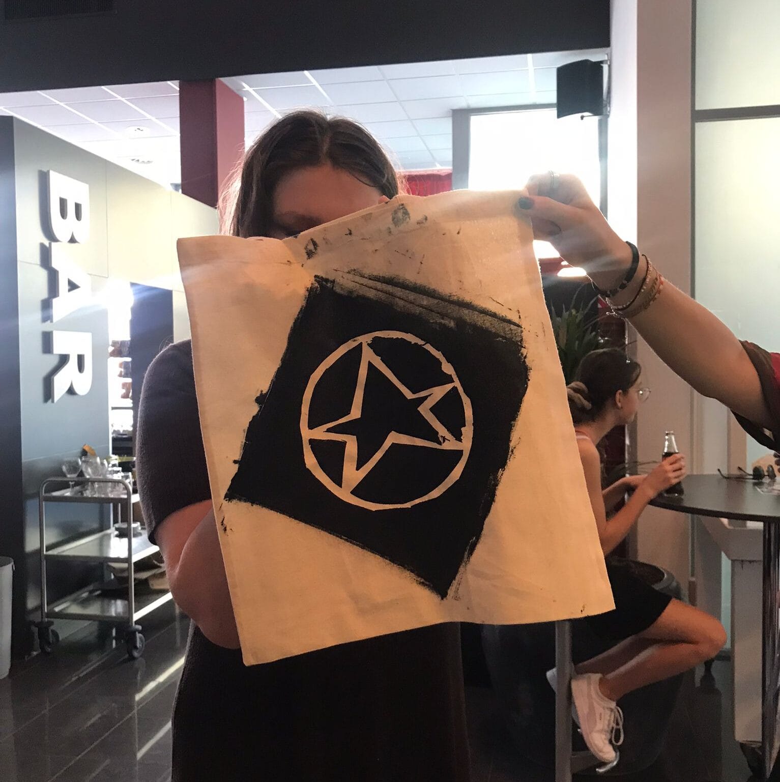 Tijdens de voorrondes van de kunstbende was de kunstfluisteraar ook van de partij en wel onder de vlag van een sympathieke opdrachtgever. Voor deze middag hebben we de deelnemers en aanhang tasjes laten ontwerpen en bedrukken met de mobiele zeefdrukkerij van de kunstfluisteraar. Het mooie van mijn mobiele zeefdrukkerij is dat deze makkelijk te vervoeren is naar iedere locatie waar een waterkraan aanwezig is. Alles staat heerlijk op wieltjes dus makkelijk op en afbouwen.